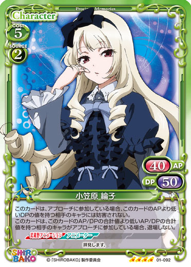 | このカードは、アプローチに参加している場合、このカードのAPより低いDPの値を持つ相手のキャラには妨害されない。このカードは、このカードのAP/DPの合計値より低いAP/DPの合計値を持つ相手のキャラがアプローチに参加している場合、退場しない。 | ||