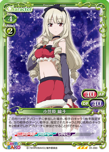 | このカードは、自分のメインフェイズ以外でも登場させることができる。このカードが登場した場合、キャラ1枚のAP/DPの値を、ターン終了時まで40/40に変更する。 | ||