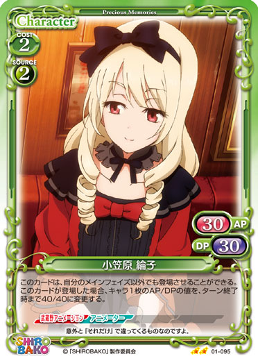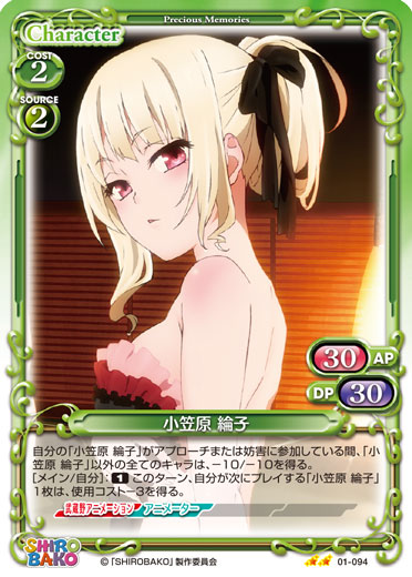 | 自分の「小笠原 綸子」がアプローチまたは妨害に参加している間、「小笠原 綸子」以外の全てのキャラは、-10/-10を得る。[メイン/自分]:《1》このターン、自分が次にプレイする「小笠原 綸子」1枚は、使用コスト-3を得る。 | ||