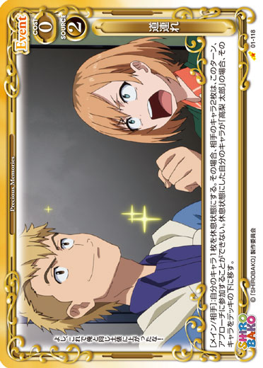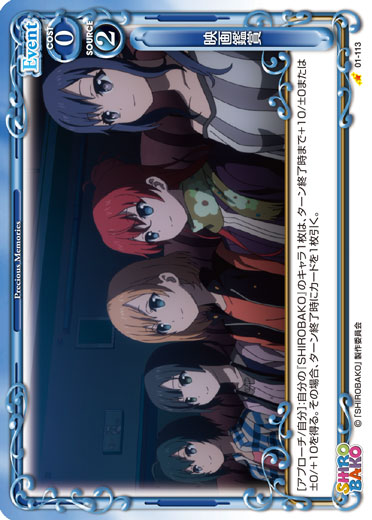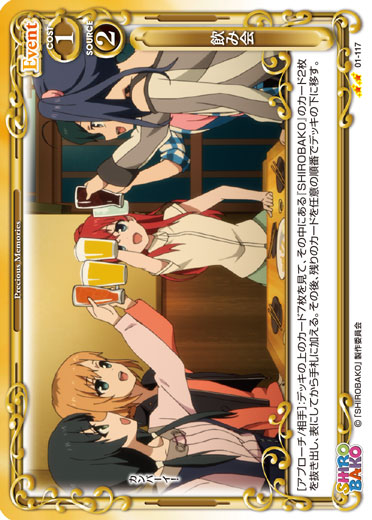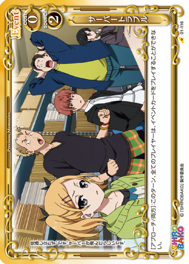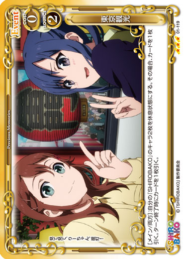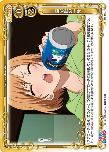 | [メイン/両方]:自分の『SHIROBAKO』のキャラ2枚を休息状態にする。その場合、カードを1枚引く。ターン終了時にカードを1枚引く。 | ||