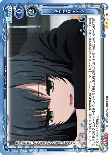 | [アプローチ/自分]:自分の『SHIROBAKO』のキャラ1枚は、ターン終了時まで+10/±0または±0/+10を得る。その場合、ターン終了時にカードを1枚引く。 | ||