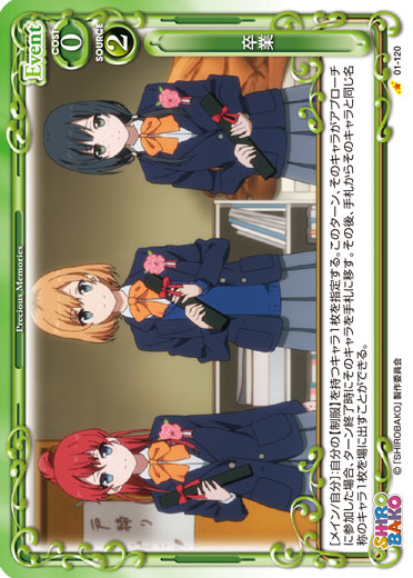 | [メイン/自分]:自分の【制服】を持つキャラ1枚を指定する。このターン、そのキャラがアプローチに参加した場合、ターン終了時にそのキャラを手札に移す。その後、手札からそのキャラと同じ名称のキャラ1枚を場に出すことができる。 | ||