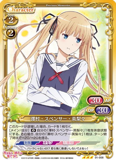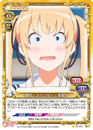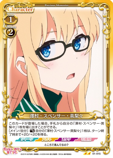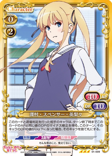 | このカードが退場した場合、カードを1枚引く。[メイン/自分]:《0》自分の「澤村・スペンサー・英梨々」1枚を休息状態にする。その場合、自分の「澤村・スペンサー・英梨々」1枚は、ターン終了時まで+20/+20を得る。 | ||