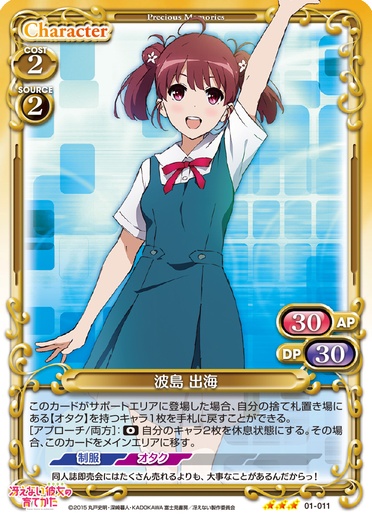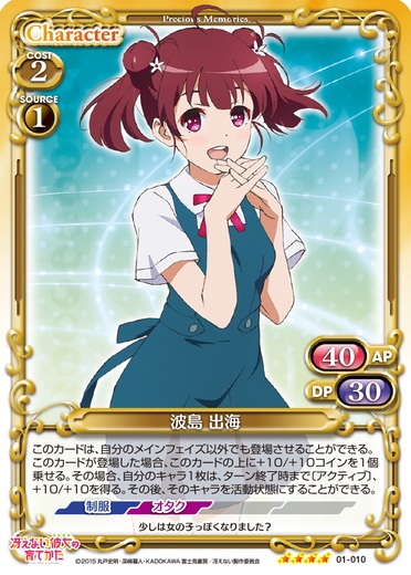 | 〔コンビ〕自分の『冴えない彼女の育てかた』のキャラがアプローチでポイントを与えた場合、カードを1枚引く。[アプローチ/自分]:《3》キャラ1枚は、ターン終了時まで+20/+20を得る。 | ||