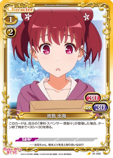 | このカードは、自分の「澤村・スペンサー・英梨々」が登場した場合、ターン終了時まで+30/+30を得る。 | ||