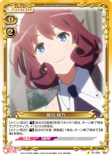 | このカードがアプローチに参加した場合、ターン終了時にカードを1枚引く。[メイン/自分]:《休》このターン、自分が次にプレイする「霞ヶ丘 詩羽」1枚は、使用コスト-2を得る。 | ||