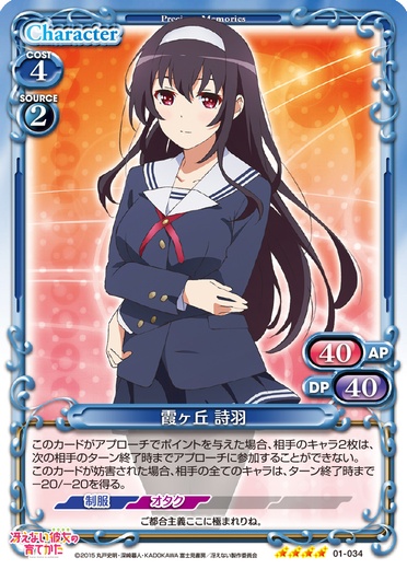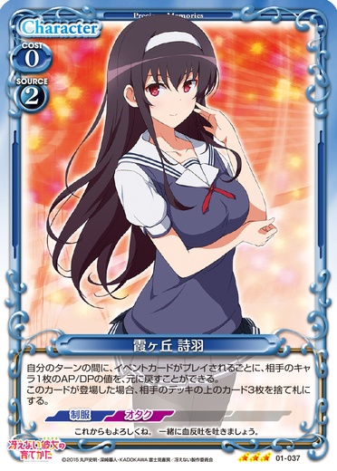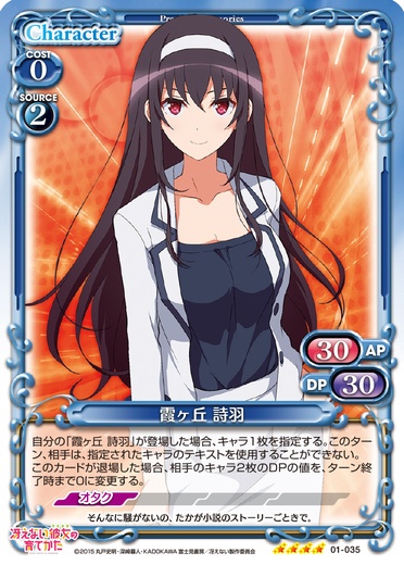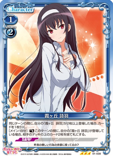 | 自分の「霞ヶ丘 詩羽」が登場した場合、キャラ1枚を指定する。このターン、相手は、指定されたキャラのテキストを使用することができない。このカードが退場した場合、相手のキャラ2枚のDPの値を、ターン終了時まで0に変更する。 | ||