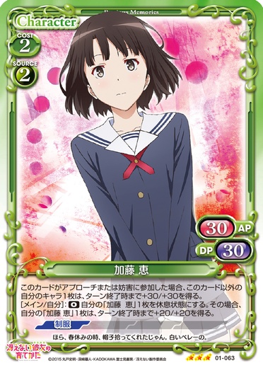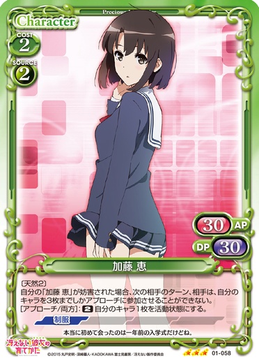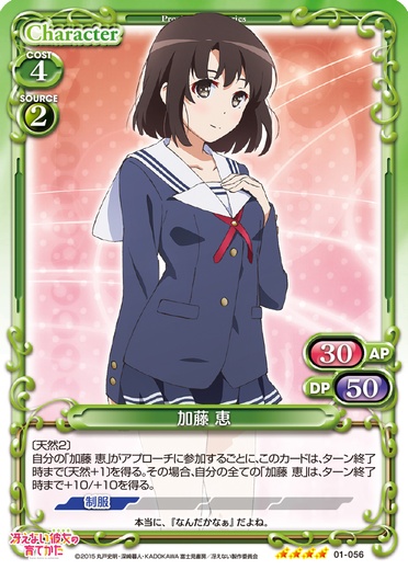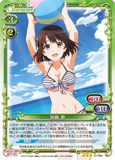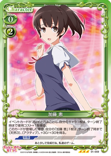 | イベントカードがプレイされるごとに、自分のキャラ1枚は、ターン終了時まで使用コスト+1を得る。このカードが登場した場合、自分の「加藤 恵」1枚は、ターン終了時まで〔天然3〕、〔アクティブ〕、+30/+30を得る。 | ||