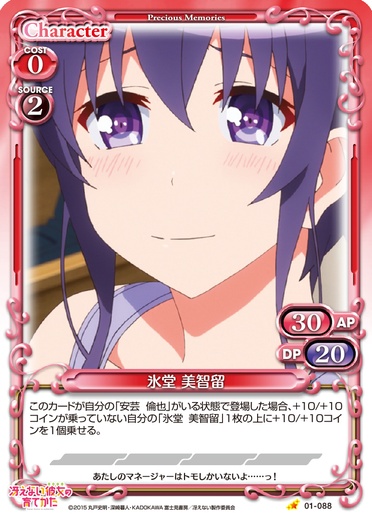 | このカードが自分の「安芸 倫也」がいる状態で登場した場合、+10/+10コインが乗っていない自分の「氷堂 美智留」1枚の上に+10/+10コインを1個乗せる。 | ||