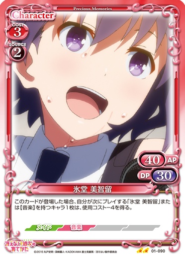 | このカードが登場した場合、自分が次にプレイする「氷堂 美智留」または【音楽】を持つキャラ1枚は、使用コスト-4を得る。 | ||