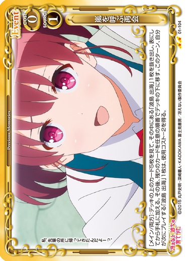 | 《使用条件》:「加藤 恵」「澤村・スペンサー・英梨々」「霞ヶ丘 詩羽」[アプローチ/自分]:このターン、アプローチフェイズ終了後、追加でメインフェイズを行う。その場合、自分のポイント置き場にあるカード1枚を表向きにすることができる。 | ||