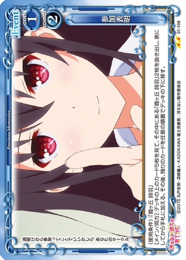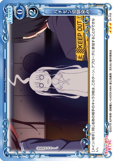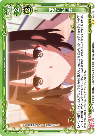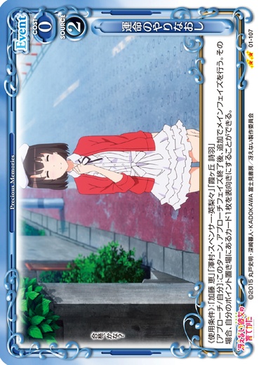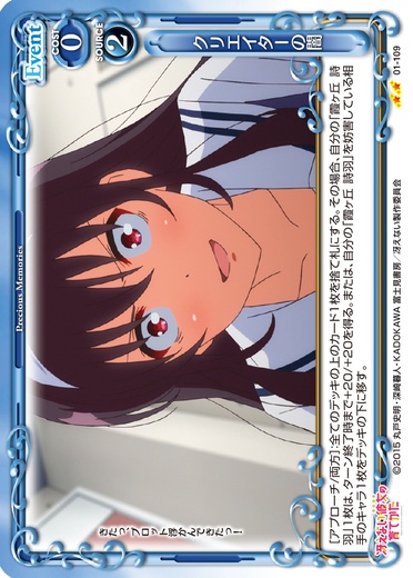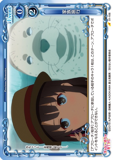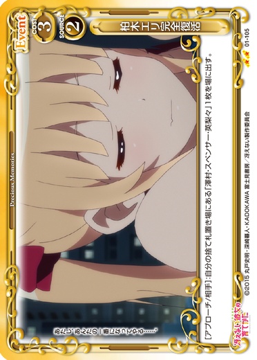 | [メイン/相手]:メインエリアにいる自分の『冴えない彼女の育てかた』のキャラ1枚をデッキの下に移す。その後、デッキの中を全て見て、その中にあるそのキャラと同じ名称のキャラ1枚を休息状態で場に出す。その後、デッキをシャッフルする。 | ||