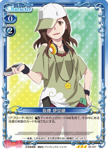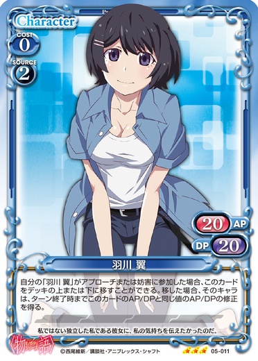 | 自分の「羽川 翼」がアプローチまたは妨害に参加した場合、このカードをデッキの上または下に移すことができる。移した場合、そのキャラは、ターン終了時までこのカードのAP/DPと同じ値のAP/DPの修正を得る。 | ||