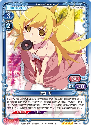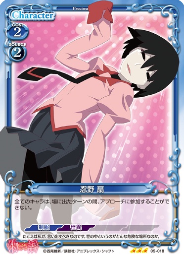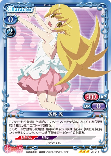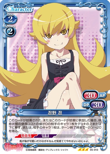 | このカードは、ゲーム中、「忍野 忍」としても扱う。このカードが妨害された場合、全てのキャラを捨て札にする。このカードがアプローチでポイントを与える場合、代わりにこのカードをゲームから取り除き、自分の全てのキャラを活動状態にする。 | ||