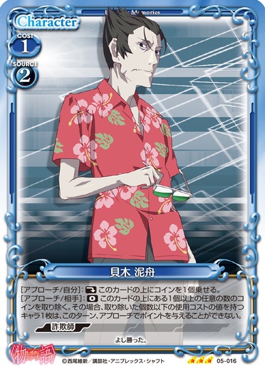 | [アプローチ/自分]:《休》このカードの上にコインを1個乗せる。[アプローチ/相手]:《0》このカードの上にある1個以上の任意の数のコインを取り除く。その場合、取り除いた個数以下の使用コストの値を持つキャラ1枚は、このターン、アプローチでポイントを与えることができない。 | ||