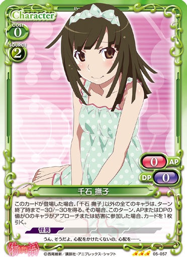 | このカードが登場した場合、「千石 撫子」以外の全てのキャラは、ターン終了時まで-30/-30を得る。その場合、このターン、APまたはDPの値が0のキャラがアプローチまたは妨害に参加した場合、カードを1枚引く。 | ||