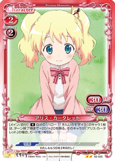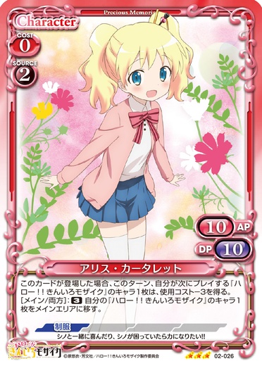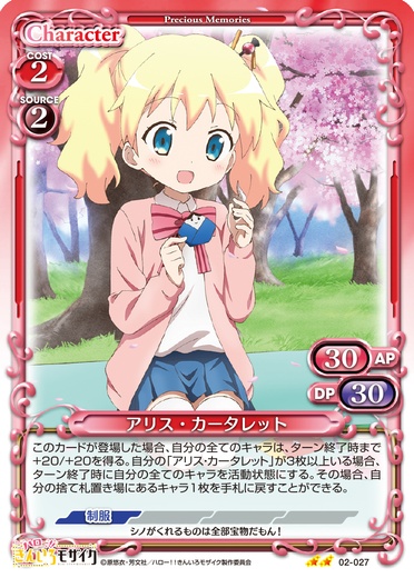 | [メイン/自分]:《1》自分の『ハロー!!きんいろモザイク』のキャラ1枚は、ターン終了時まで+20/+20を得る。そのキャラが「アリス・カータレット」の場合、カードを1枚引く。 | ||