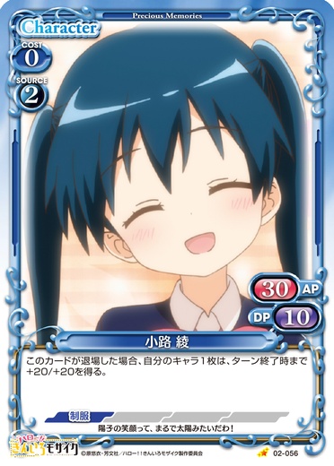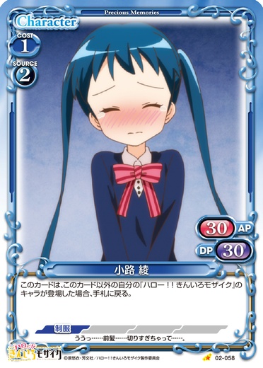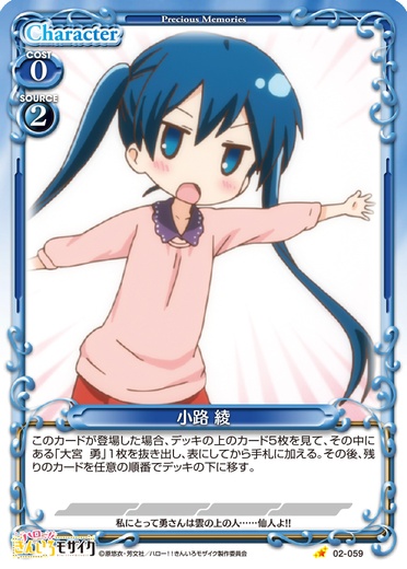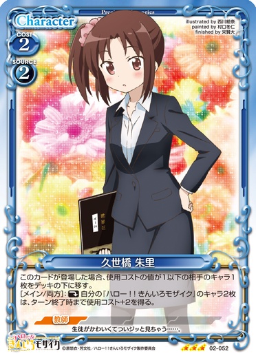 | このカードは、このカード以外の自分の『ハロー!!きんいろモザイク』のキャラが登場した場合、手札に戻る。 | ||