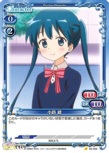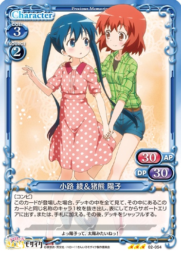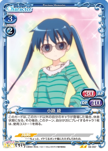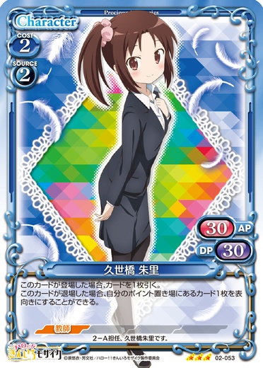 | このカードが登場した場合、使用コストの値が1以下の相手のキャラ1枚をデッキの下に移す。[メイン/両方]:《休》自分の『ハロー!!きんいろモザイク』のキャラ2枚は、ターン終了時まで使用コスト+2を得る。 | ||