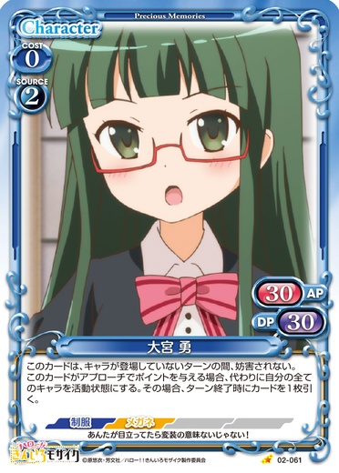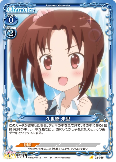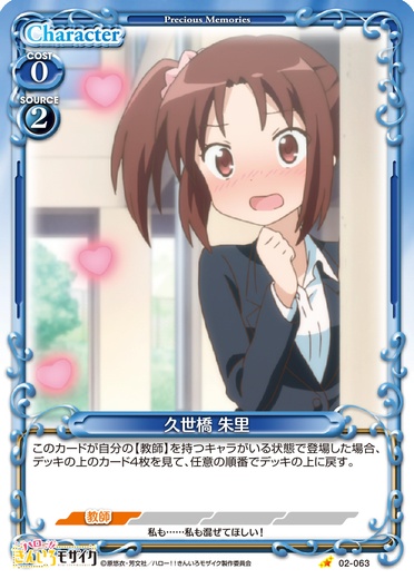 | [メイン/自分]:《休》このカードをデッキの下に移す。その場合、自分の捨て札置き場にある【教師】を持つキャラ1枚を手札に戻す。 | ||