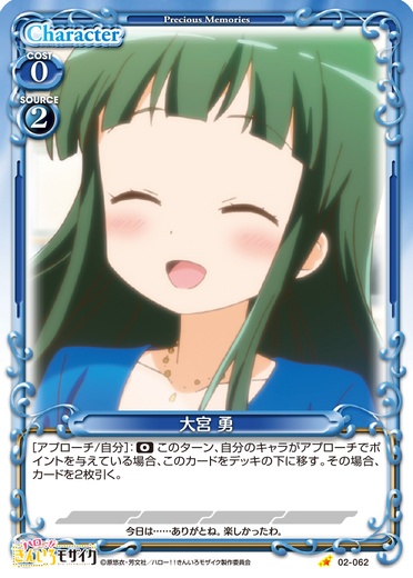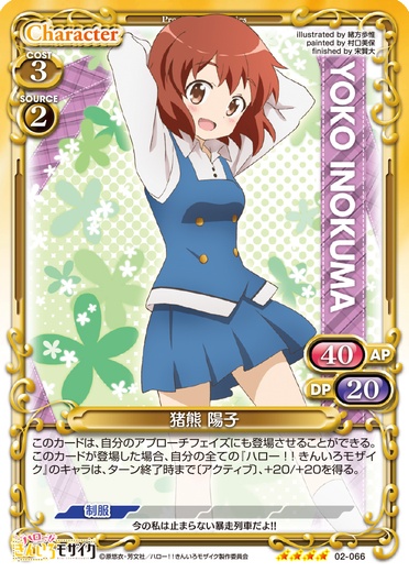 | このカードは、自分のアプローチフェイズにも登場させることができる。このカードが登場した場合、自分の全ての『ハロー!!きんいろモザイク』のキャラは、ターン終了時まで〔アクティブ〕、+20/+20を得る。 | ||