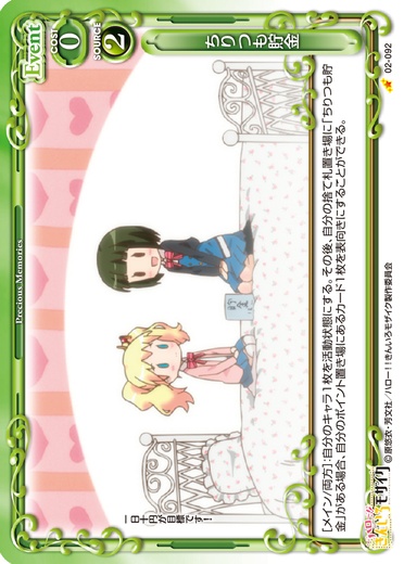 | [メイン/両方]:自分のキャラ1枚を活動状態にする。その後、自分の捨て札置き場に「ちりつも貯金」がある場合、自分のポイント置き場にあるカード1枚を表向きにすることができる。 | ||