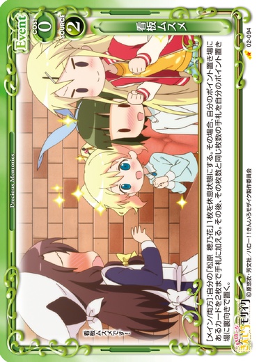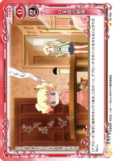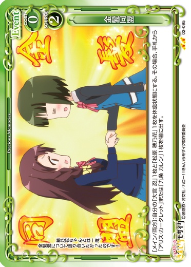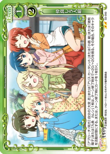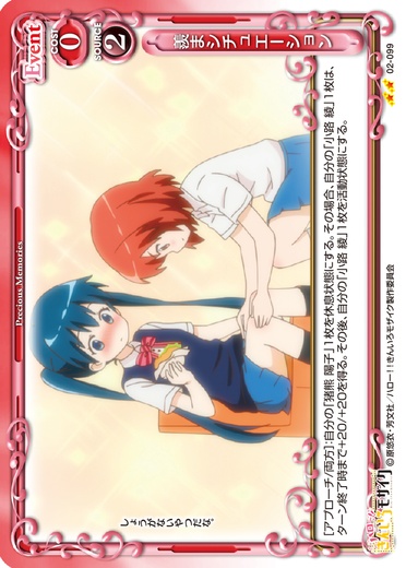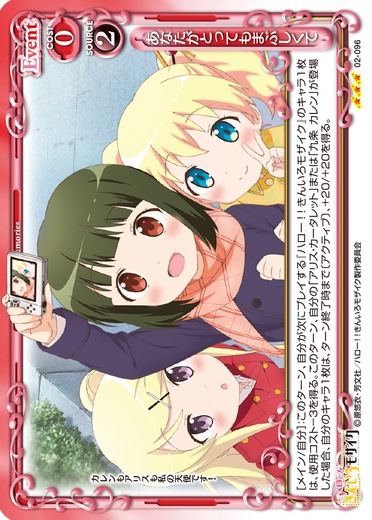 | [アプローチ/両方]:自分の「大宮 忍」または「アリス・カータレット」または「小路 綾」または「猪熊 陽子」または「九条 カレン」1枚は、ターン終了時まで+20/+20を得る。その場合、そのキャラを活動状態にする。または、ターン終了時にカードを1枚引く。 | ||