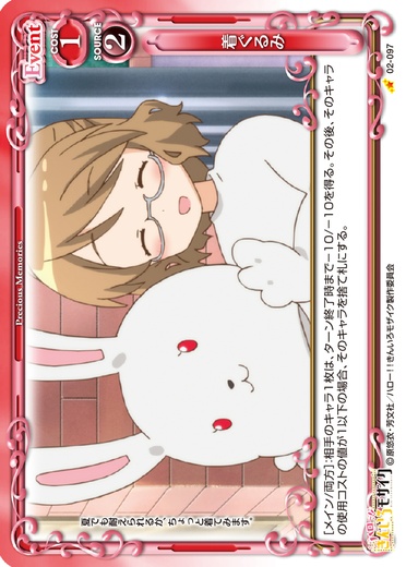 | [メイン/両方]:相手のキャラ1枚は、ターン終了時まで-10/-10を得る。その後、そのキャラの使用コストの値が1以下の場合、そのキャラを捨て札にする。 | ||
