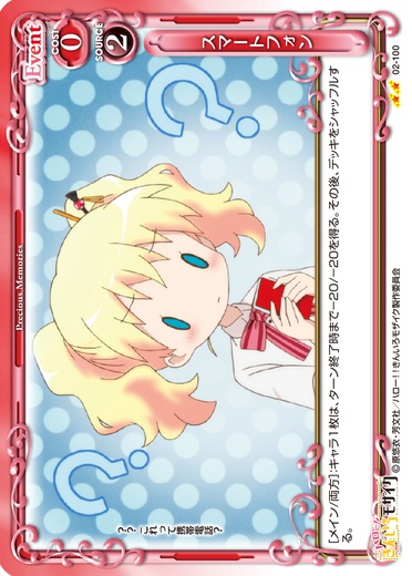 | [メイン/両方]:キャラ1枚は、ターン終了時まで-20/-20を得る。その後、デッキをシャッフルする。 | ||