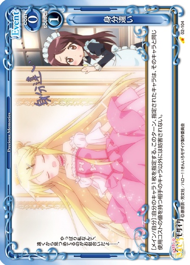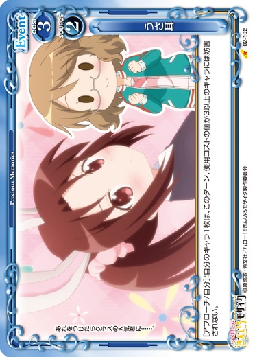 | [メイン/自分]:自分のキャラ1枚を指定する。このターン、指定されたキャラは、そのキャラと同じ使用コストの値を持つ相手のキャラ以外には妨害されない。 | ||