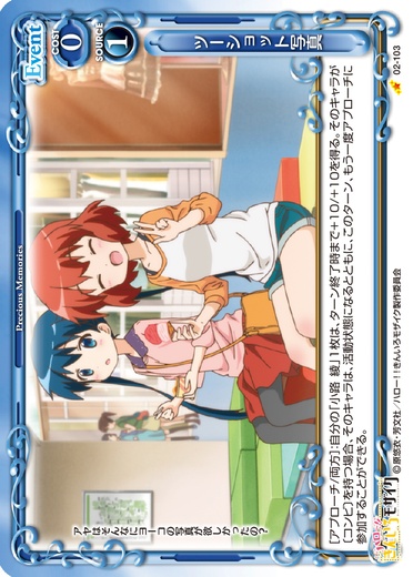 | [アプローチ/両方]:自分の「小路 綾」1枚は、ターン終了時まで+10/+10を得る。そのキャラが〔コンビ〕を持つ場合、そのキャラは、活動状態になるとともに、このターン、もう一度アプローチに参加することができる。 | ||