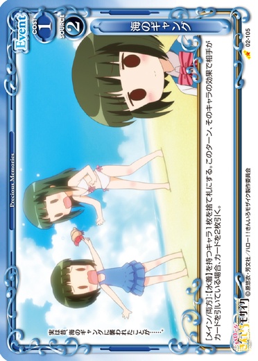 | [メイン/両方]:【水着】を持つキャラ1枚を捨て札にする。このターン、そのキャラの効果で相手がカードを引いている場合、カードを2枚引く。 | ||