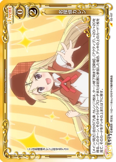 | [メイン/両方]:自分の「九条 カレン」1枚は、ターン終了時まで【探偵】、〔アクティブ〕、+20/+20を得る。このターン、そのキャラがアプローチまたは妨害に参加した場合、デッキの上のカード1枚を見て、そのカードをデッキの上または下に移す。 | ||