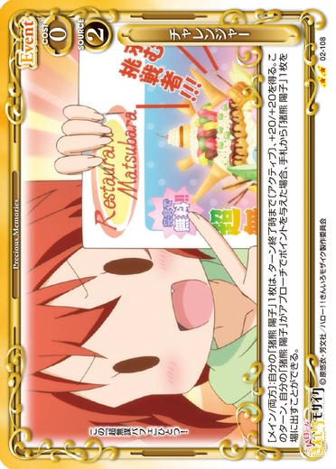 | [メイン/自分]:《0》デッキの上のカード2枚を捨て札にする。その中に【清澄高校】を持つキャラが含まれている場合、カードを1枚引く。その場合、自分の捨て札置き場にある【清澄高校】を持つキャラ1枚をデッキの上に移すことができる。 | ||