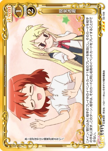 | 〔コンビ〕〔アクティブ〕〔逆境4〕:「+20/+20」このカードは、発生コストの値が2のキャラには妨害されない。このカードが妨害された場合、自分の捨て札置き場にある『咲-Saki-全国編』のイベントカード1枚を手札に戻すことができる。 | ||