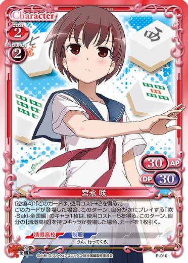 | 〔逆境4〕:「このカードは、使用コスト+2を得る。」このカードが登場した場合、このターン、自分が次にプレイする『咲-Saki-全国編』のキャラ1枚は、使用コスト-5を得る。このターン、自分の【清澄高校】を持つキャラが登場した場合、カードを1枚引く。 | ||