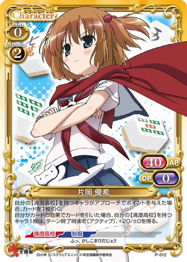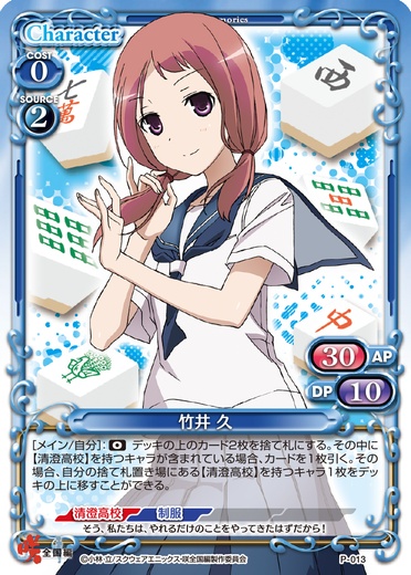| 〔コンビ〕このカードが登場した場合、デッキの上のカード10枚を見て、その中にある『咲-Saki-全国編』のキャラ1枚と、【清澄高校】を持つキャラ1枚を抜き出し、表にしてから手札に加える。その後、デッキをシャッフルする。 | ||