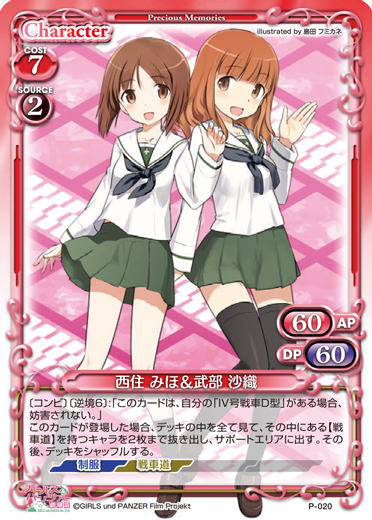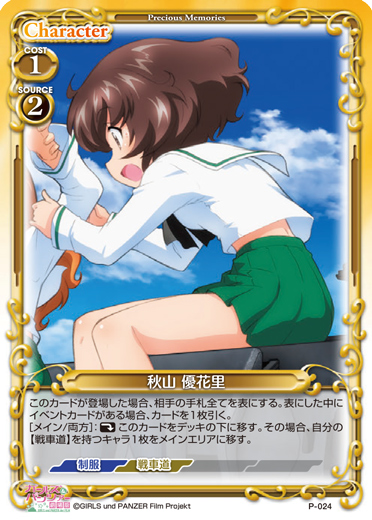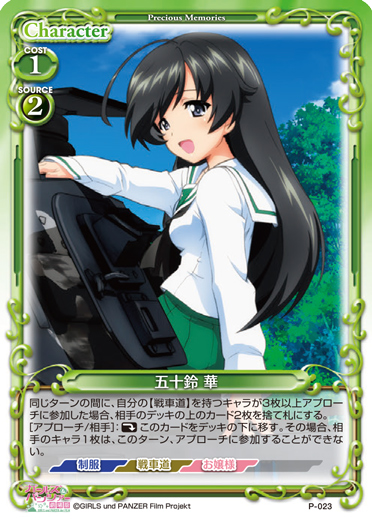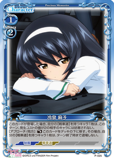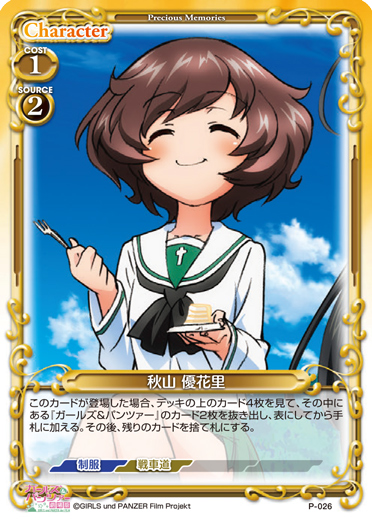 | このカードが登場した場合、デッキの上のカード4枚を見て、その中にある『ガールズ&パンツァー』のカード2枚を抜き出し、表にしてから手札に加える。その後、残りのカードを捨て札にする。 | ||