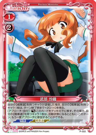 | このカードが登場した場合、自分の【戦車道】を持つキャラ1枚は、このターン、発生コストの値が2の相手のキャラには妨害されない。[アプローチ/両方]:《休》このカードをデッキの下に移す。その場合、自分の【戦車道】を持つキャラ1枚は、ターン終了時まで退場しない。 | ||