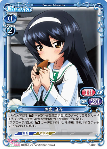 | このカードが登場した場合、自分の捨て札置き場にある「西住 みほ」1枚をサポートエリアに出す。[メイン/両方]:《休》このカードをデッキの下に移す。その場合、このターン、自分が次にプレイする【戦車道】を持つキャラ1枚は、使用コスト-4を得る。 | ||