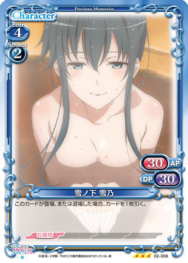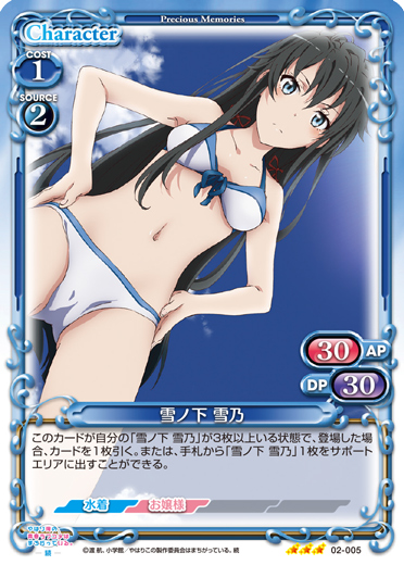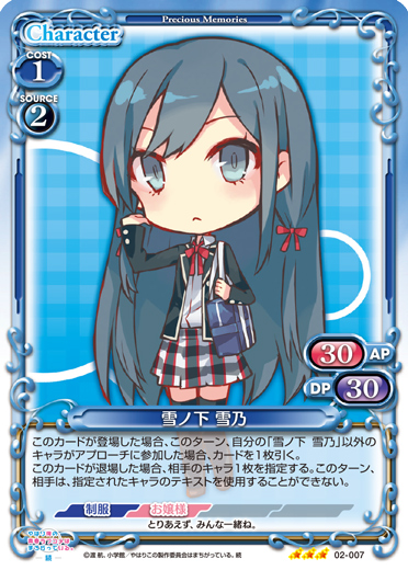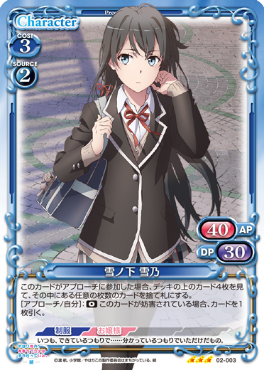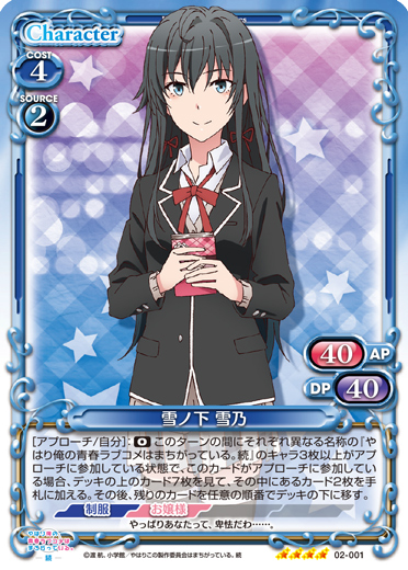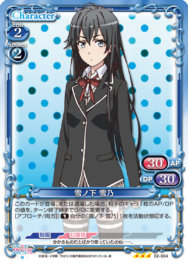 | このカードが登場、または退場した場合、相手のキャラ1枚のAP/DPの値を、ターン終了時まで0/0に変更する。[アプローチ/両方]:《1》自分の「雪ノ下 雪乃」1枚を活動状態にする。 | ||
