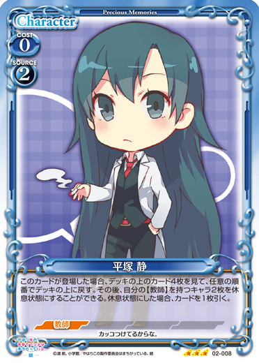 | このカードが登場した場合、デッキの上のカード4枚を見て、任意の順番でデッキの上に戻す。その後、自分の【教師】を持つキャラ2枚を休息状態にすることができる。休息状態にした場合、カードを1枚引く。 | ||