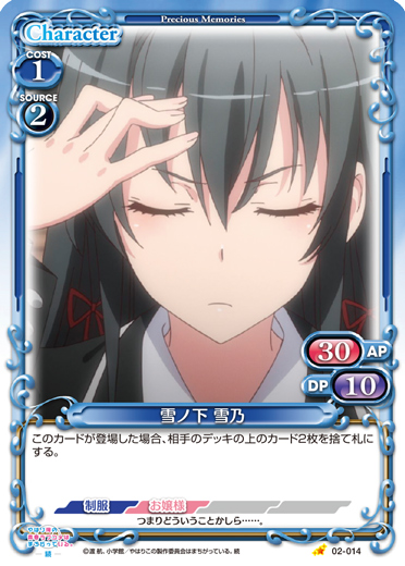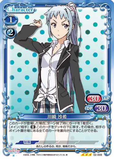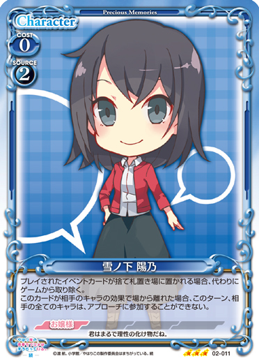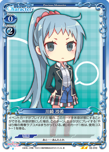 | イベントカードがプレイされた場合、このカードを休息状態にすることができる。休息状態にした場合、このターン、自分が次にプレイする『やはり俺の青春ラブコメはまちがっている。続』のカード1枚は、使用コスト-1を得る。 | ||