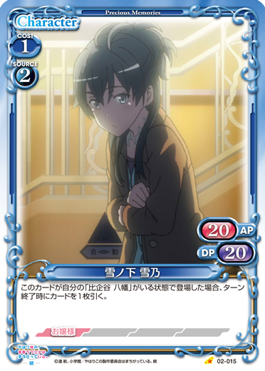 | このカードが自分の「比企谷 八幡」がいる状態で登場した場合、ターン終了時にカードを1枚引く。 | ||