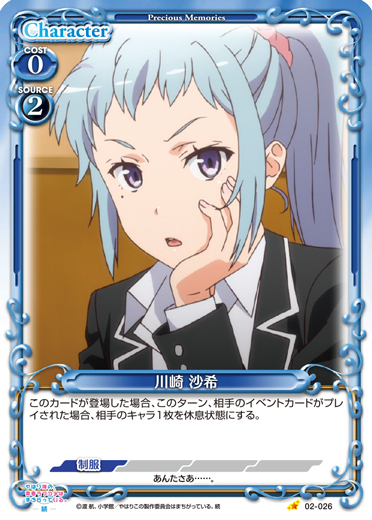 | このカードが登場した場合、このターン、相手のイベントカードがプレイされた場合、相手のキャラ1枚を休息状態にする。 | ||