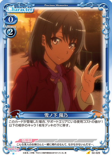 | このカードが登場した場合、サポートエリアにいる使用コストの値が1以下の相手のキャラ1枚をデッキの下に移す。 | ||