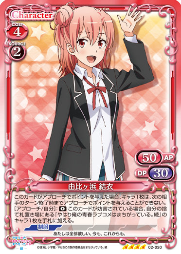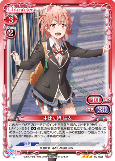 | このカードがアプローチでポイントを与えた場合、カードを2枚引く。[メイン/自分]:《0》任意の枚数の手札を捨て札にする。その場合、このターン、このカードは、捨て札にしたカードの枚数以下の使用コストの値を持つ相手のキャラには妨害されない。 | ||