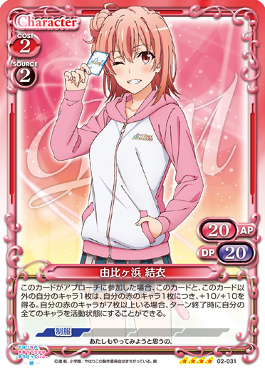 | このカードがアプローチに参加した場合、このカードと、このカード以外の自分のキャラ1枚は、自分の赤のキャラ1枚につき、+10/+10を得る。自分の赤のキャラが7枚以上いる場合、ターン終了時に自分の全てのキャラを活動状態にすることができる。 | ||