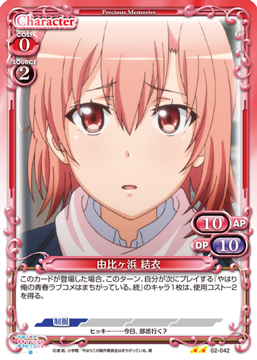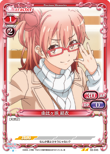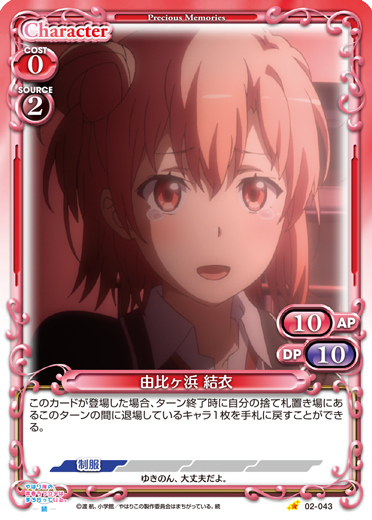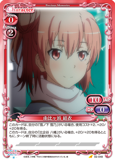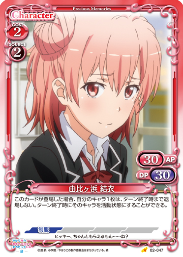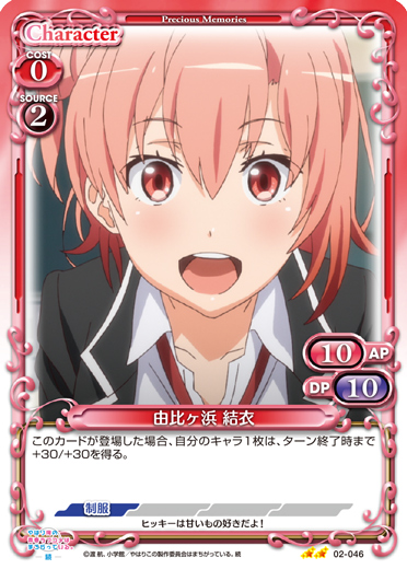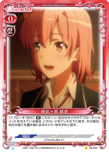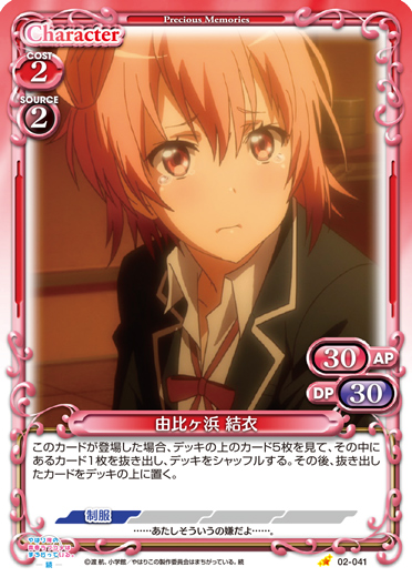 | このカードが登場した場合、このターン、自分が次にプレイする『やはり俺の青春ラブコメはまちがっている。続』のキャラ1枚は、使用コスト-2を得る。 | ||