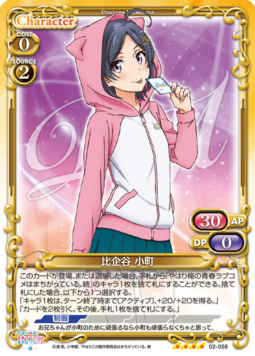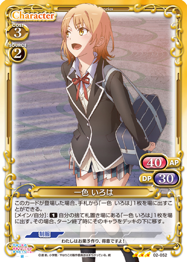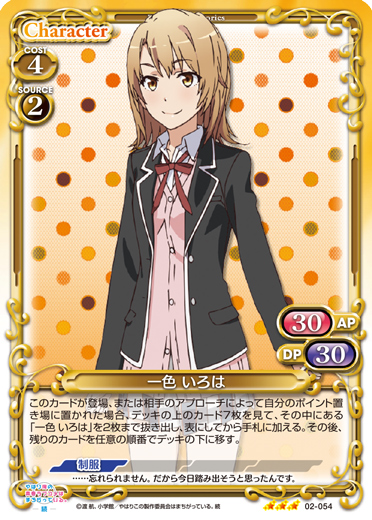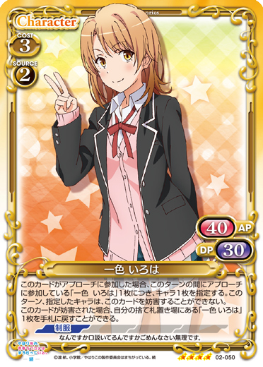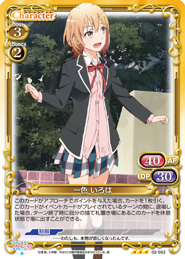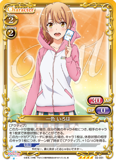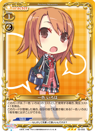 | このカードは、「一色 いろは」のコストとして使用する場合、発生コスト+1を得る。このカードが登場した場合、自分の捨て札置き場にある「一色 いろは」1枚を場に出すことができる。 | ||